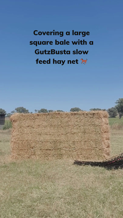 We have a video on how to put a GutzBusta Hay Net on a large square 8x3x3, 8x4x3 & 8x4x4 bale here. We also have a great blog article on how to put a GutzBusta on a Large Square Bale.