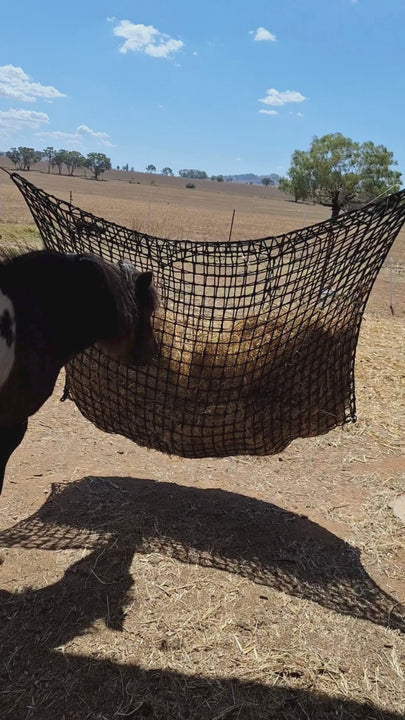 Although they are capable of holding a full small bale, due to our unique square shaped holes, it doesn’t matter if you have one biscuit of hay in this net, or half a small bale or have the hay net chock full, your animals will still be able to graze from the hay net, unlike diamond shaped holes that collapse down on each other as the hay net empties, leading to frustration for the horse when they get to the end.